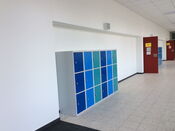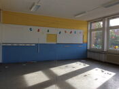 Sanierungstrakt: Wir haben die grünen Tafeln zur Verbesserung der Haptik wieder eingeführt. Alle Klassenräume haben eine blaue Tafelwand und blauen Fußboden. Die neuen Fenster sind abschließbar und auch ein elektrischer Sonnenschutz ist vorhanden. WLAN wird es demnächst auch überall geben. Die neuen Fächerschränke auf dem Flur sind auch sehr schön.