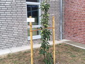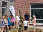Sie hatten einen Apfelbaum für die Schule, gesponsert vom Arkadia Gartencenter in Arpke, dabei. Den haben wir dann vor der neuen Schulmensa gemeinsam eingepflanzt.
