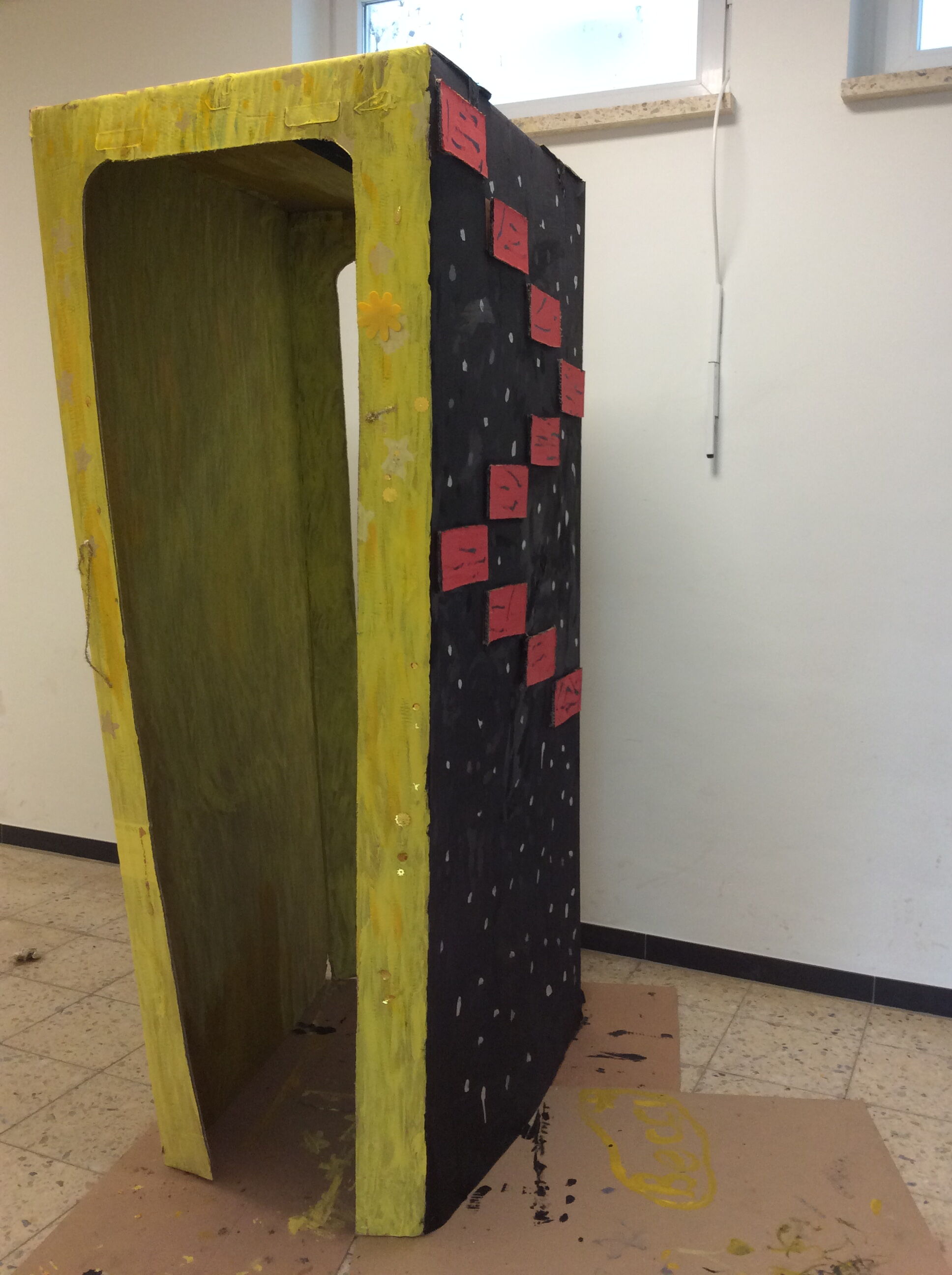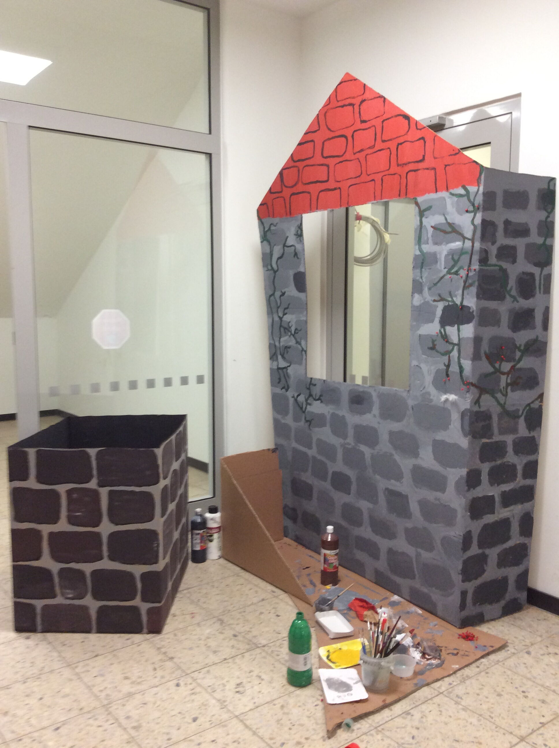 sie Schülerinnen der 4b bauen Kulissen für das Theaterstück „Frau Holle“. Dies wird auf der Abschlussfeier der 4. Klassen und auf der Einschulung aufgeführt.