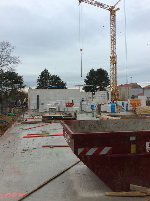 es tut sich wieder einiges auf unserer Baustelle: Das Fundament des Kindergartens ist mittlerweile gegossen. Unübersehbar wurde auch ein Kran zur Unterstützung bei den kommenden Arbeiten aufgestellt. Der Technikanbau vor der Schule steckt zwar noch in den Kinderschuhen, wächst aber stetig.
